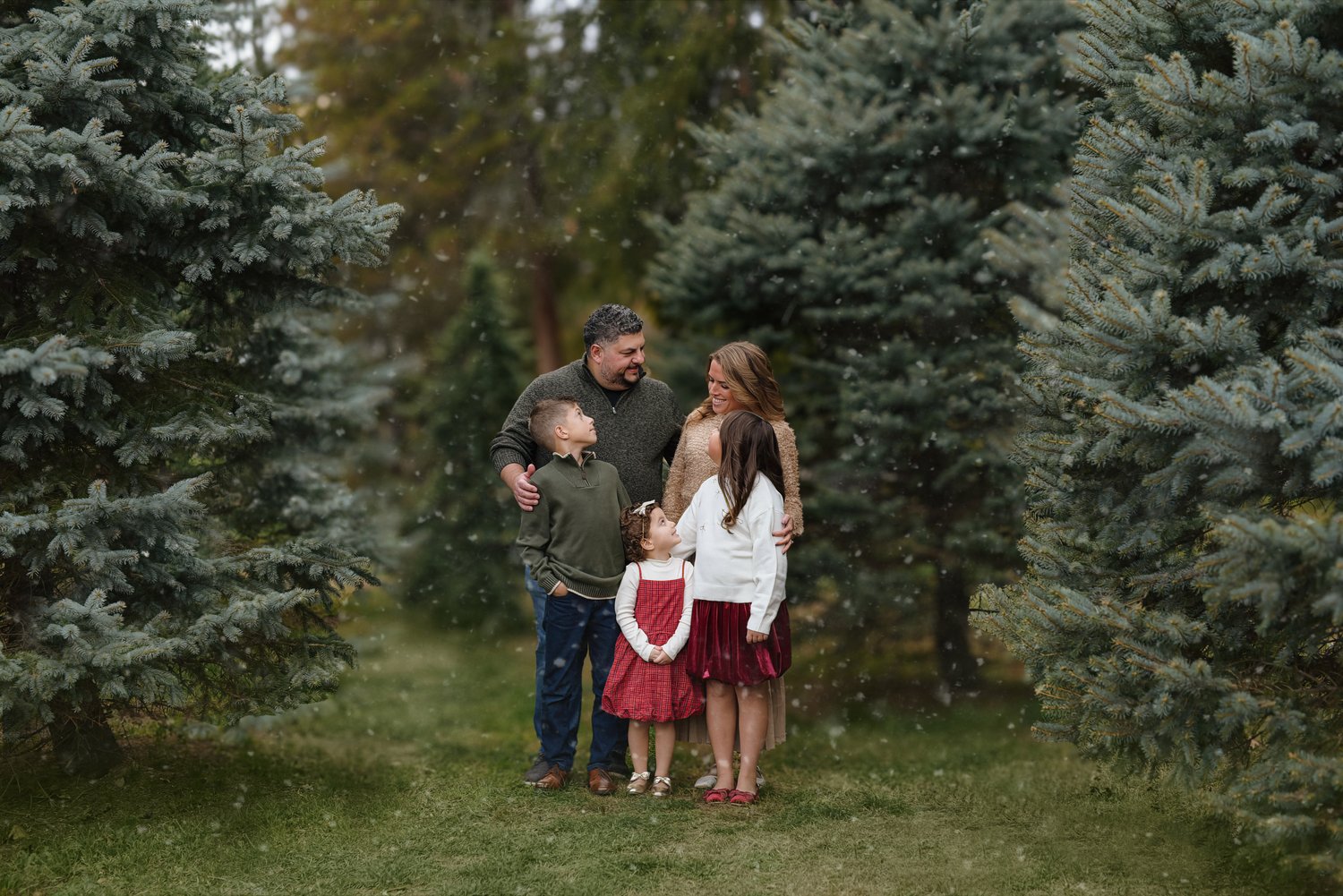 Step into the magic of the season! These sessions take place in a beautiful park with spruce trees that mimic a real tree farm — perfect for holiday portraits. Families can capture timeless memories, and those wishing to add a touch of wonder can even incorporate a magical reindeer. (Reindeer is photoshopped in) There is no physical reindeer at the session :)